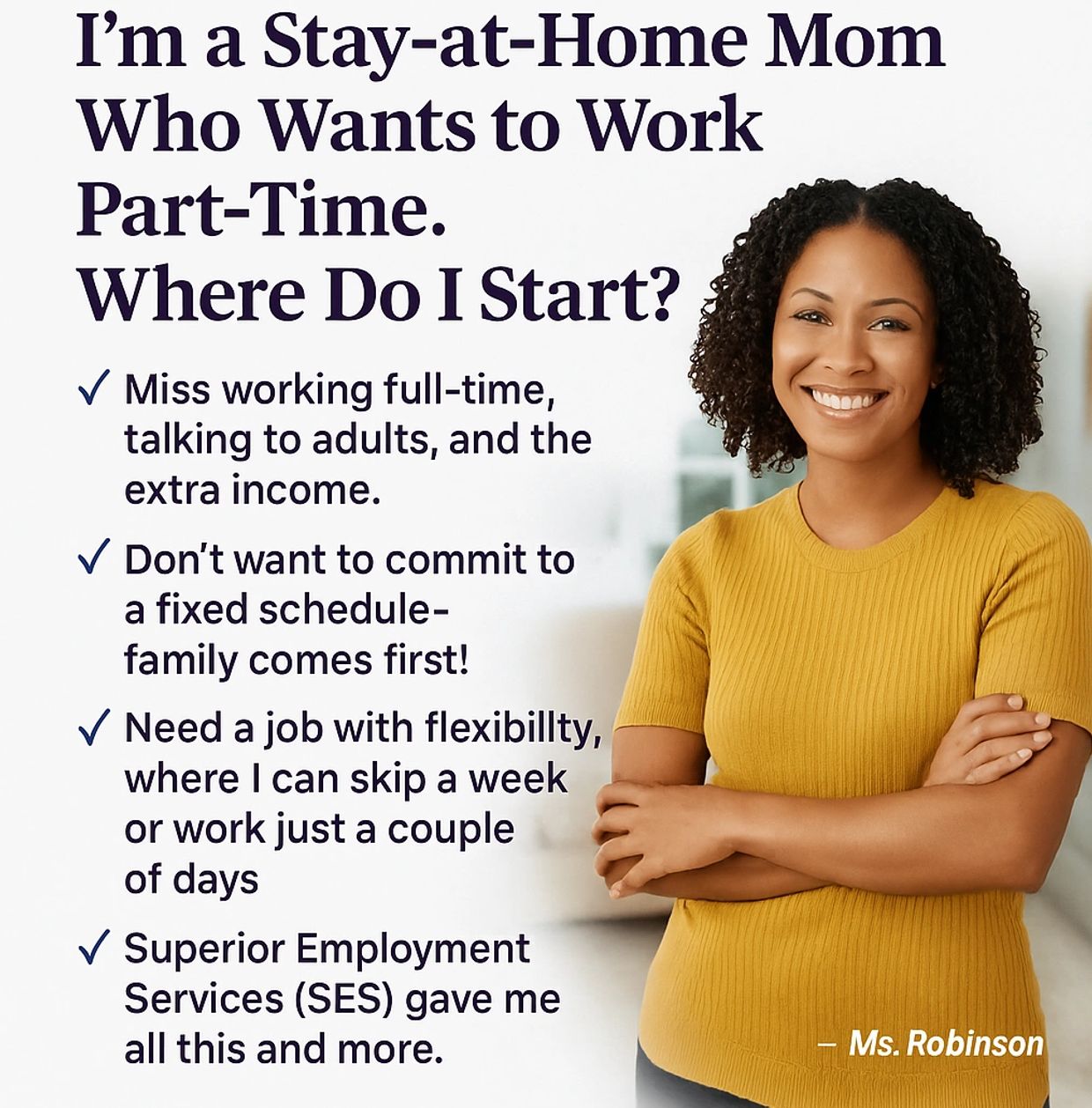 Being a mom is one of the hardest and most rewarding jobs there is. But if you’re ready to add something new to your life—without giving up what matters most—Superior Employment Services is here to help.